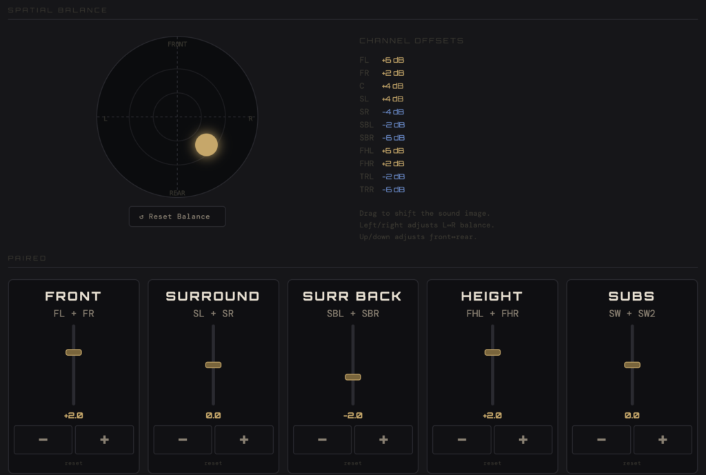 Next up I’m thinking of keying together listening room profiles per track, keyed into what’s playing on Spotify so the entire balance of the system can auto-configure based on what’s playing. This would then include custom listening profiles and sound stages I’d set up for specific favourite tracks. It’s almost as if one could take all this too far*…?