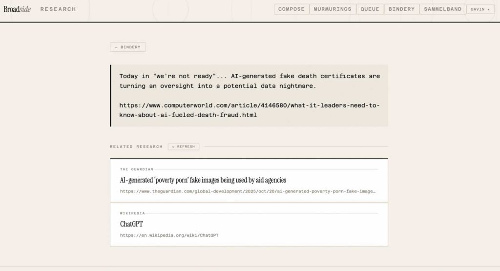 We can all now build personalised infrastructure, in hours or days, that would have taken dedicated teams many months or years before. Broadside is an example of this: a small act of reclaiming your relationship with your own writing, from the platforms you publish on and can control.